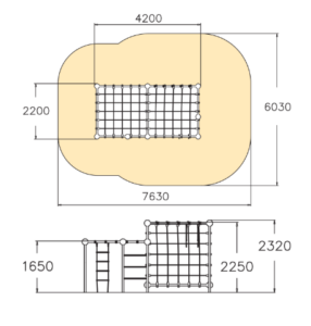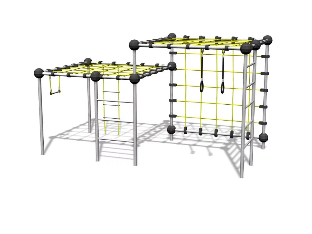 Спортивно-игровой комплекс, состоящий из двух кубов разного размера. Комплекс включает в себя веревочную и железную лестницы, подвесную трапецию и кольца, а также канатную стену для лазания.