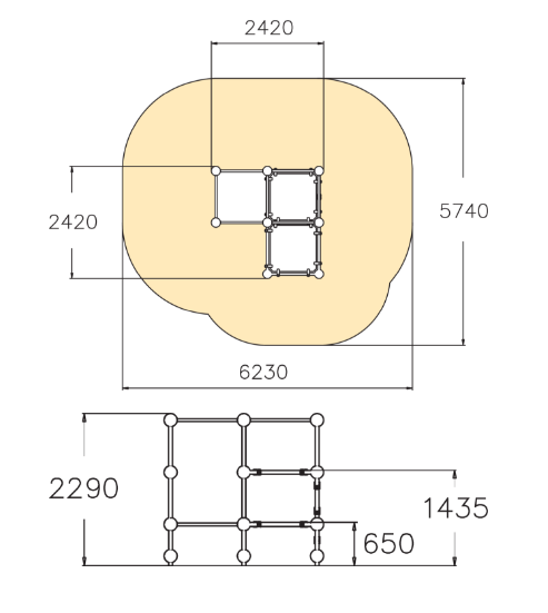 Спортивно-игровой комплекс, который включает в себя рамы разной высоты, стенку и секции для лазания, прохода и прыжков.