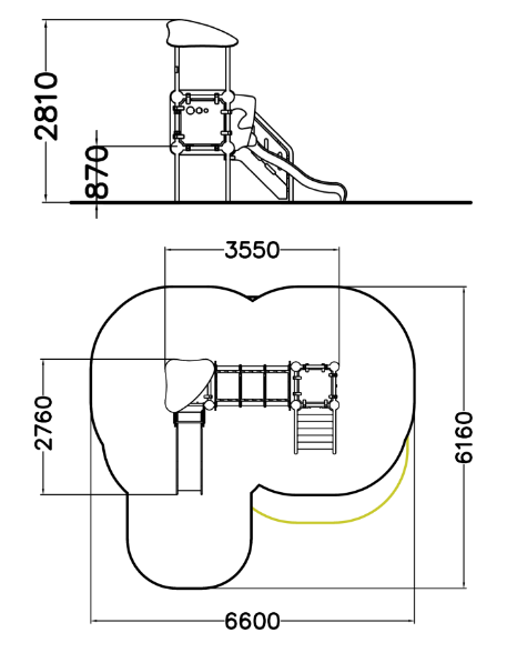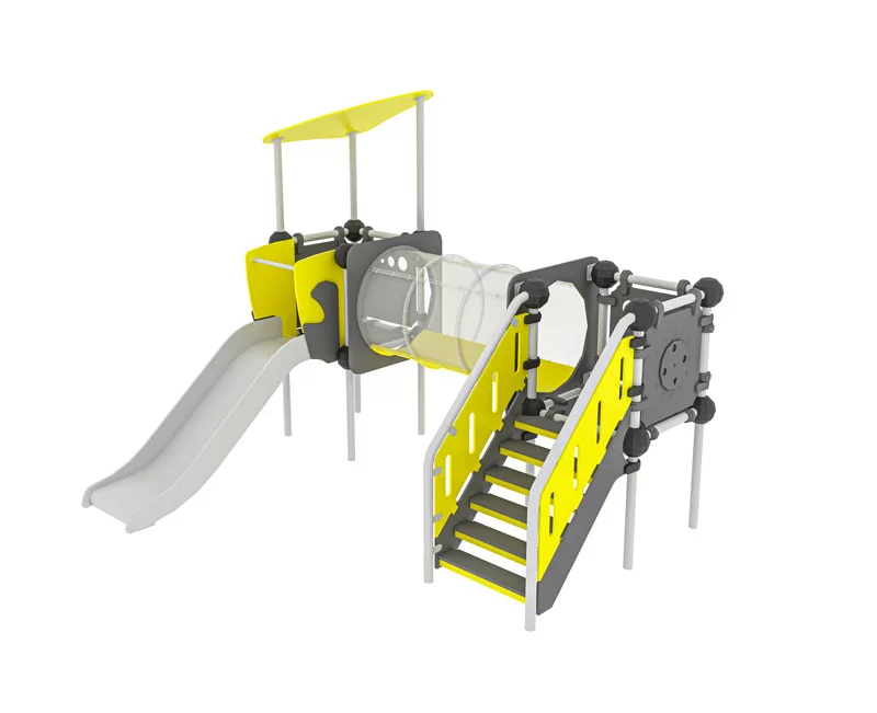 Уличный игровой комплекс, состоящий из горки с навесом, лестницы и тоннеля из прозрачного поликарбоната, который их соединяет.
