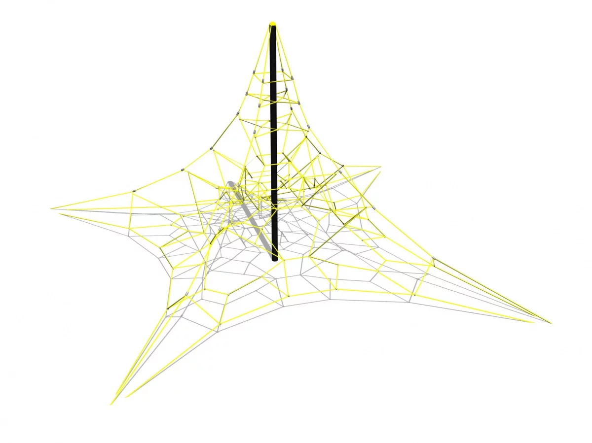 Изготовлен из металла и армированных канатов, образующих плетеный лабиринт для лазания.