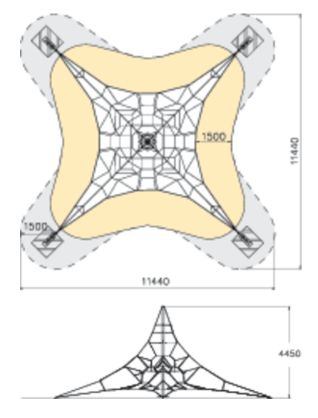 Комплекс сделан из металла и армированных канатов образующих плетеный лабиринт для лазания.