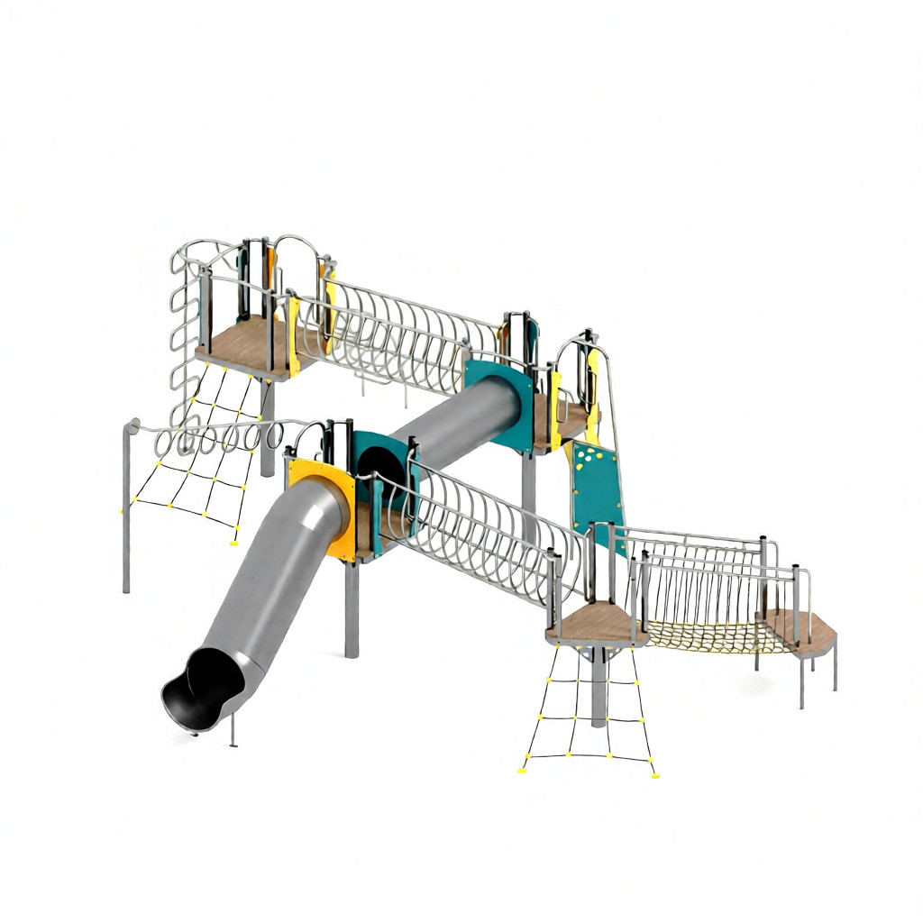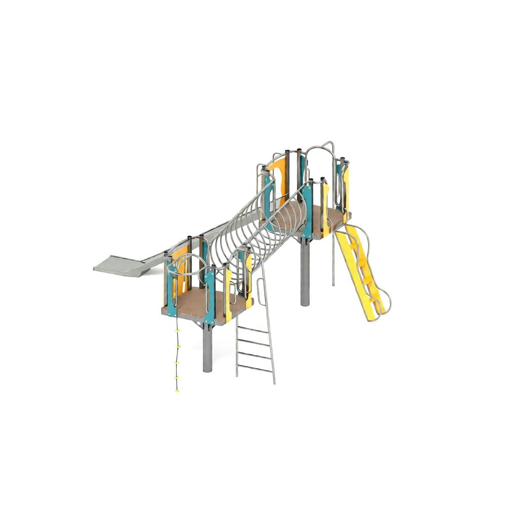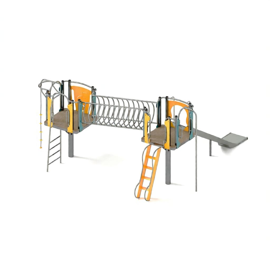 Детский городок состоит из двух башен, соединенных мостом. Одна из башен оборудована горкой для веселых спусков, а каждая башня имеет свою лестницу.