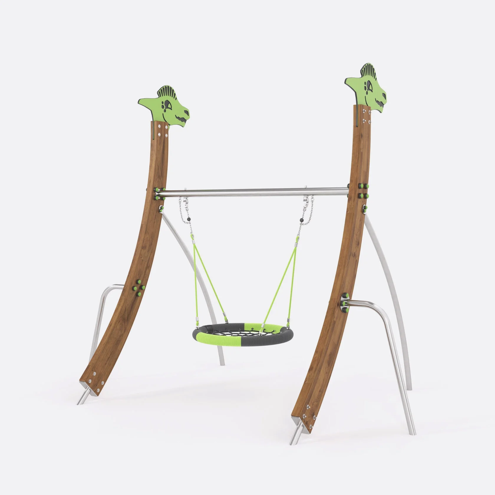 Игровая конструкция для детских площадок. Представляет из себя качель с канатным подвесом и сиденьем типа «Гнездо». Каркас качели выполнен подвесную объемную канатную конструкцию на каркасе из гнутоклеенного лиственного бруса и гнутых труб из нержавеющей стали.