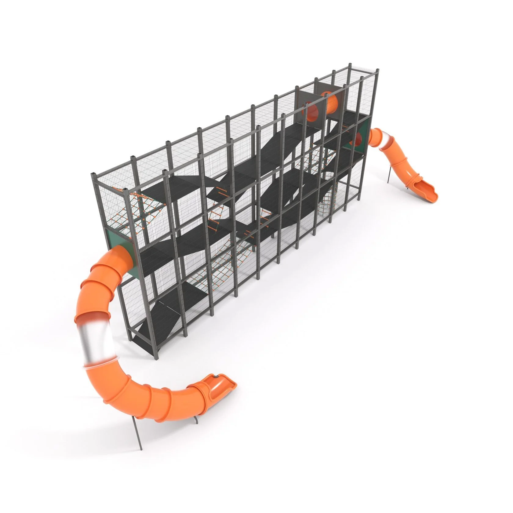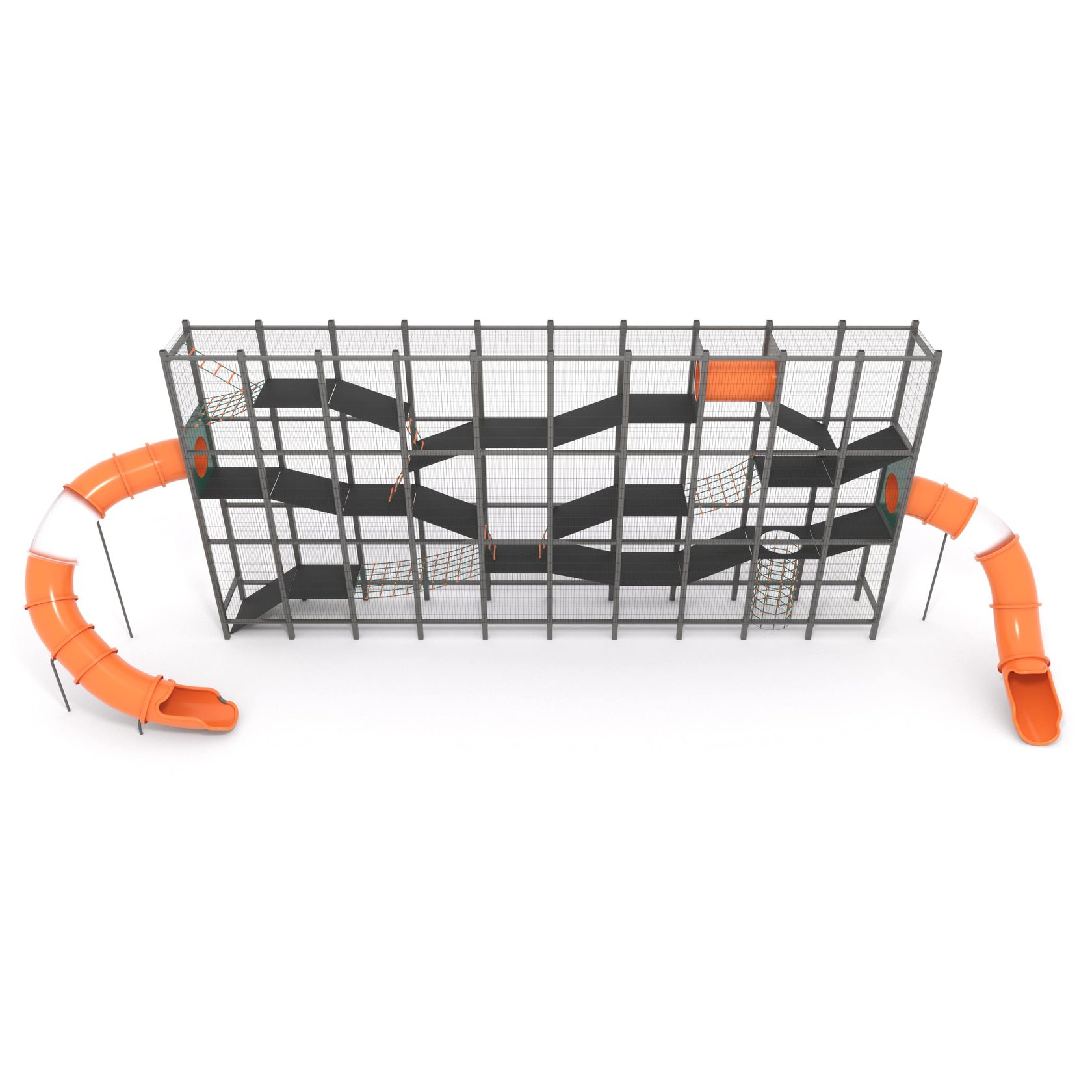 Игровой комплекс «Клетка» с габаритными размерами 12500х1250х6000 мм. Несущий каркас комплекса выполнен из металлических труб сечением 100х100 и 100х50 мм с защитным порошковым покрытием RAL7016. По периметру каркас закрыт защитной металлической оцинкованной сеткой с размером клетки 50х200 мм. Полы и вертикальные перегородки выполнены из ламинированной фанеры толщиной не менее 21 мм. Канатные части выполнены из полипропиленового армированного 6-прядного каната Ø16 мм, х-образные и т-образные соединения канатов выполнены из полиамида (ПА6). Туннельные горки и переходы выполнены из пластика (LLDPE) с толщиной стенки 5 мм и опорными стойками из трубы Ø89 мм.