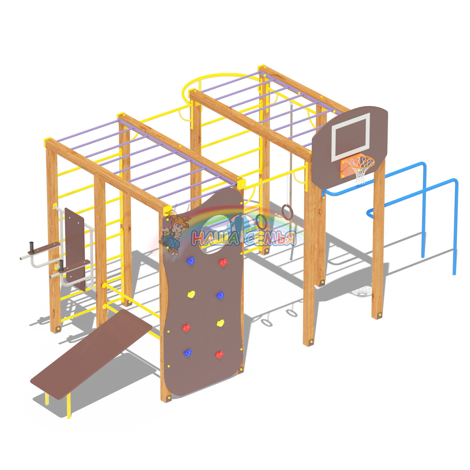 В комплекс входит баскетбольное кольцо, позволяющее детям развивать меткость и координацию движений. Брусья предоставляют возможность укрепить верхнюю часть тела и развить силу. Снаряды для пресса помогут укрепить мышцы живота и корпуса.