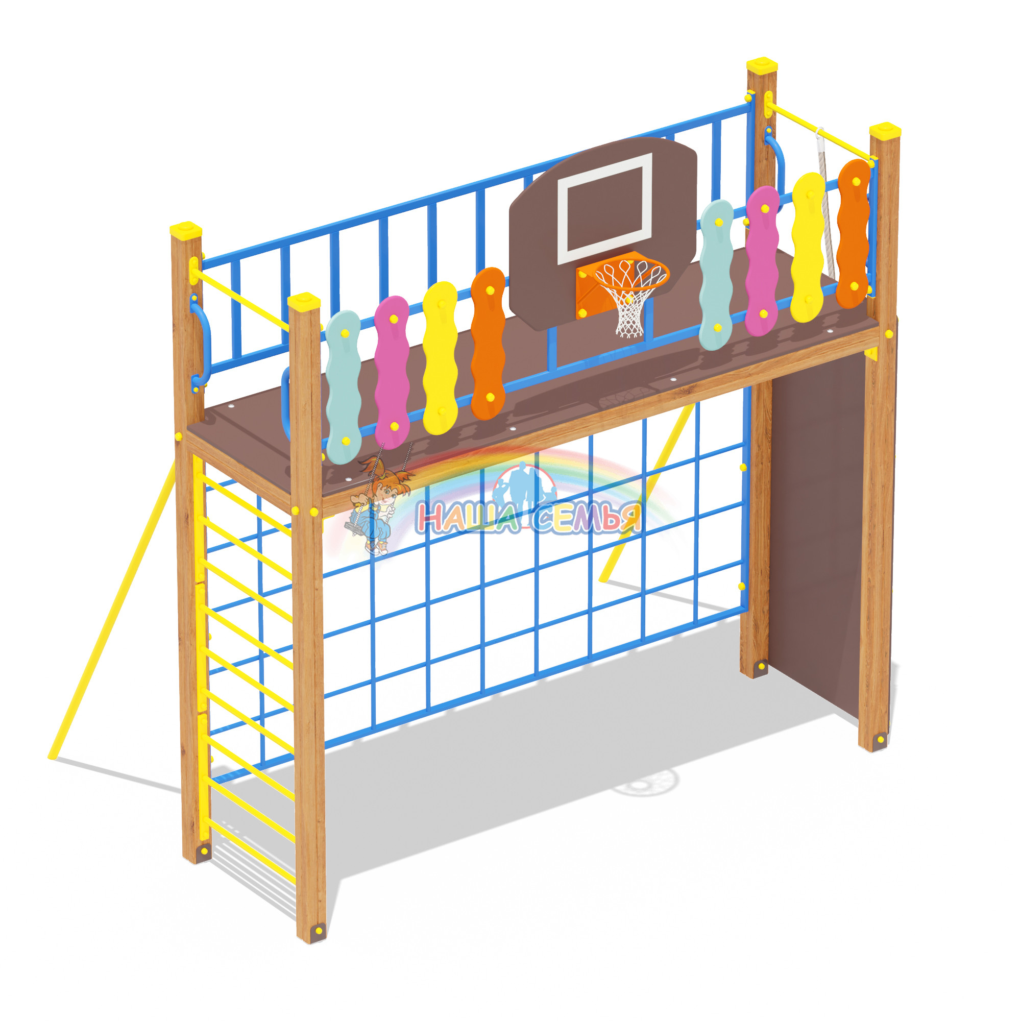 Спортивный комплекс Тип 1 оснащен лестницей, решеткой, баскетбольной сеткой и скалодромом. Такой спортивный комплекс подходит для организации территории школ и детских садов для детей старшего возраста. Он поможет правильно, с пользой организовать досуг в детских садах и детских учебных заведениях. Занимаясь, дети будут развивать выносливость, укреплять свое здоровье, оттачивать координацию движений.