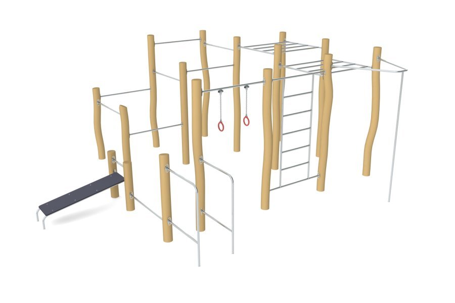 В данной категории представлено оборудование для занятия активным спортом (опорные стойки из древесины). Промежутки и стыки между элементами оборудования разработаны так, чтобы не допустить застревания конечностей, туловища и головы ребёнка, при этом конструкция не даст ему перевернуться или выпасть. Проработана возможность доступа взрослого при обстоятельствах, требующих посторонней помощи ребёнку.