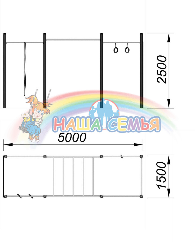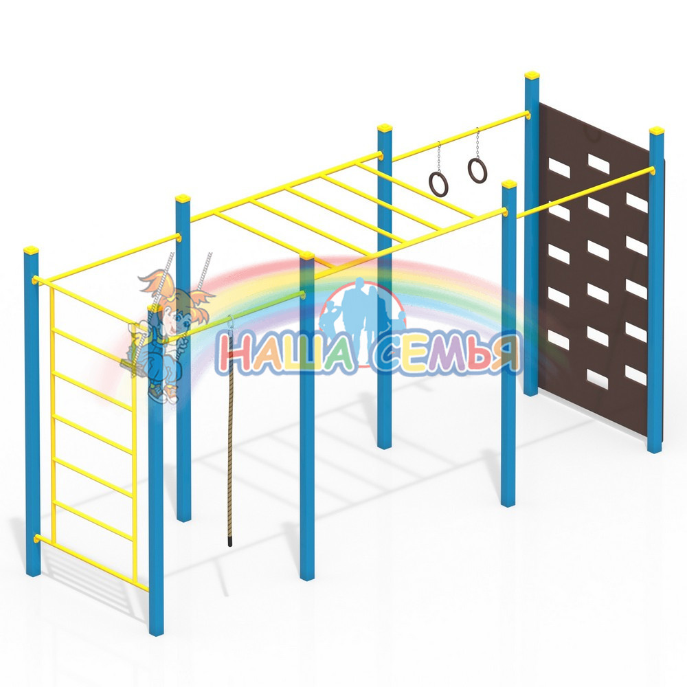 Спортивный комплекс для воркаут Тип 11 — это группа спортивных снарядов, расположенных в одну полосу. В нее входят несколько турников, шведская стенка, рукоход, кольца, стена для перелезания и канат. Такой комплекс прекрасно впишется даже в самую небольшую спортивную площадку благодаря удачному расположению элементов.